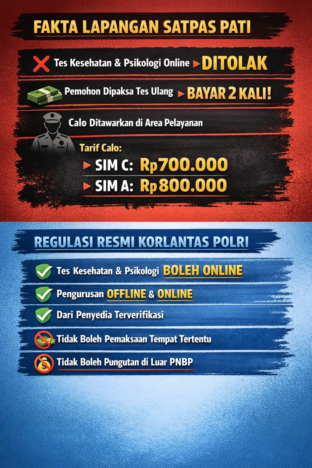 Tes Online Sah, Tapi Ditolak di Lapangan, beberapa pemohon SIM mengaku telah melengkapi persyaratan resmi berupa surat kesehatan dan tes psikologi secara online dari penyedia yang terdaftar, Namun saat mengurus perpanjangan SIM di Satpas Pati, dokumen tersebut ditolak tanpa penjelasan yang transparan.