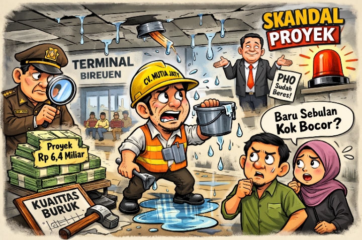 Rakyat Merdeka .Com l- BIREUEN, Sabtu (21/2/2026) – Aroma persoalan kembali menyelimuti proyek revitalisasi Terminal Tipe B Kabupaten Bireuen. Belum genap dua bulan pasca Provisional Hand Over (PHO), plafon bangunan yang dibiayai Rp6,4 miliar dari APBA 2025 itu dilaporkan bocor saat hujan deras mengguyur wilayah tersebut.