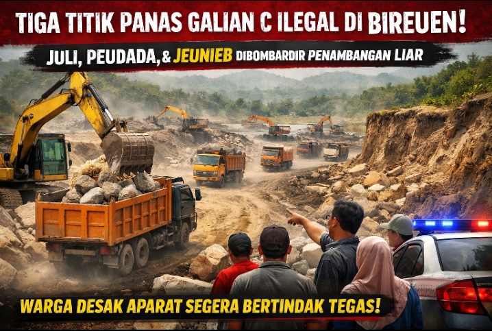 Rakyat Mardeka.com l-BIREUEN — Aktivitas galian C ilegal di Kabupaten Bireuen kini tak lagi sekadar meresahkan, tetapi sudah masuk tahap mengkhawatirkan. Di sejumlah titik seperti Kecamatan Juli, Peudada, dan Jeunieb, praktik pengambilan batu gajah berlangsung terang-terangan seolah tanpa hukum.