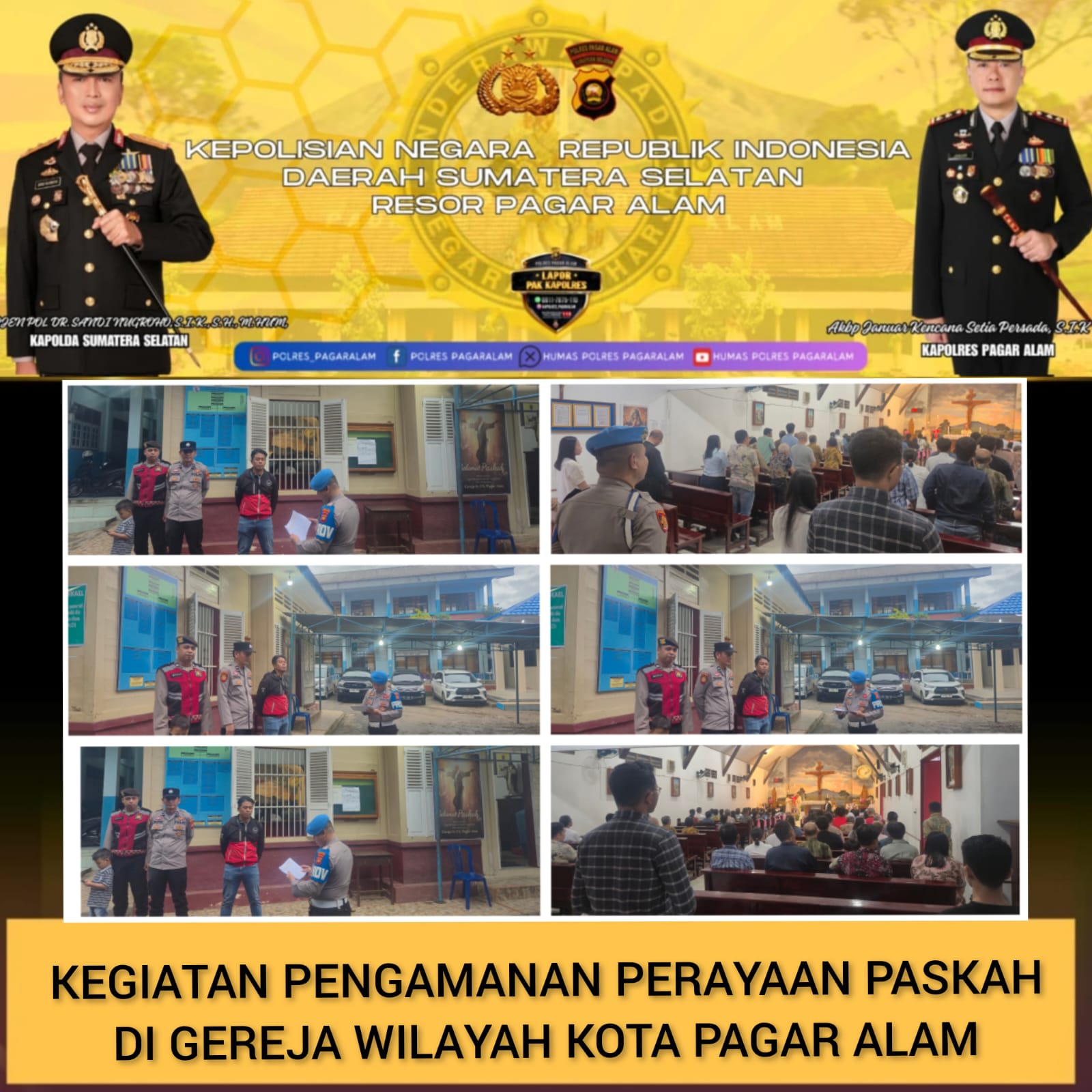 Pengamanan terpusat di Gereja St. FX Xaverius yang beralamat di Jalan Jenderal A. Yani No.1, Kelurahan Sukorejo, Kecamatan Pagar Alam Utara, pada Minggu (05/04/2026) pukul 17.00 WIB. Ibadah Paskah di gereja tersebut diikuti sekitar 100 jemaat dan berlangsung dengan tertib hingga selesai.