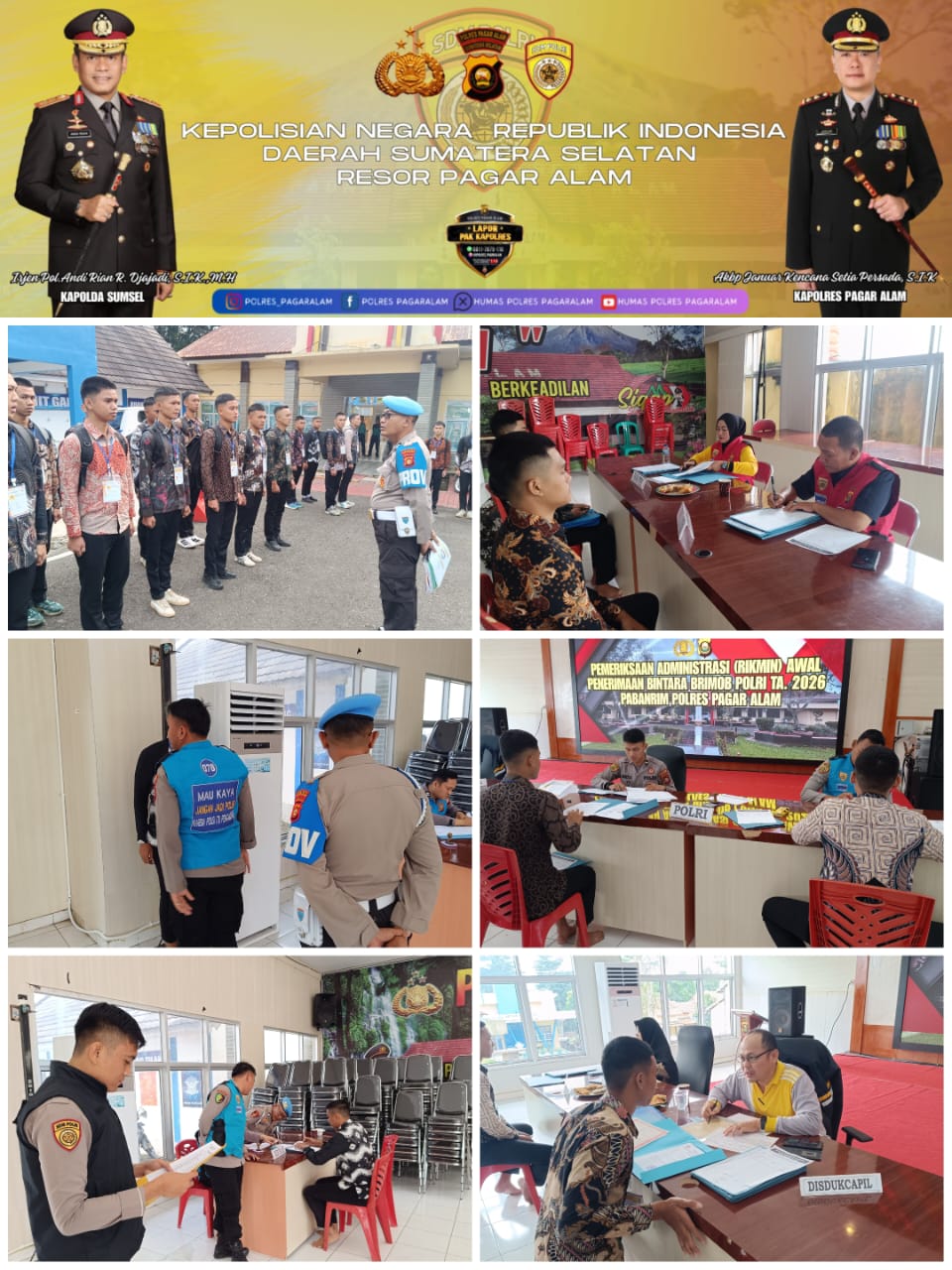 Pada hari Jumat, 21/11/2025 seleksi penerimaan bintara Brimob digelar di Aula Wira Satya 96 Polres Pagar Alam dengan tahapan pemeriksaan administrasi (Rikmin) awal pelamar melibatkan tim pengawas eksternas dan internal yang di libatkan dalam penerimaan seleksi kali ini. Dari pengawas eksternal yang turut mengawasi seleksi masuk Bintara Brimob Polri yaitu dari Dinas Pendidikan dan Kebudayaan (Disdikbud), Disdukcapil, dan PWI Kota Pagar Alam. Pengawasan yang sangat ketat ini diharapkan melahirkan penerimaan polri Yang bersih dari KKN Sedikitnya 34 peserta ikut ambil bagian dan dinyatakan lolos RIkmin awal pada seleksi penerimaan bintara Brimob Polri.