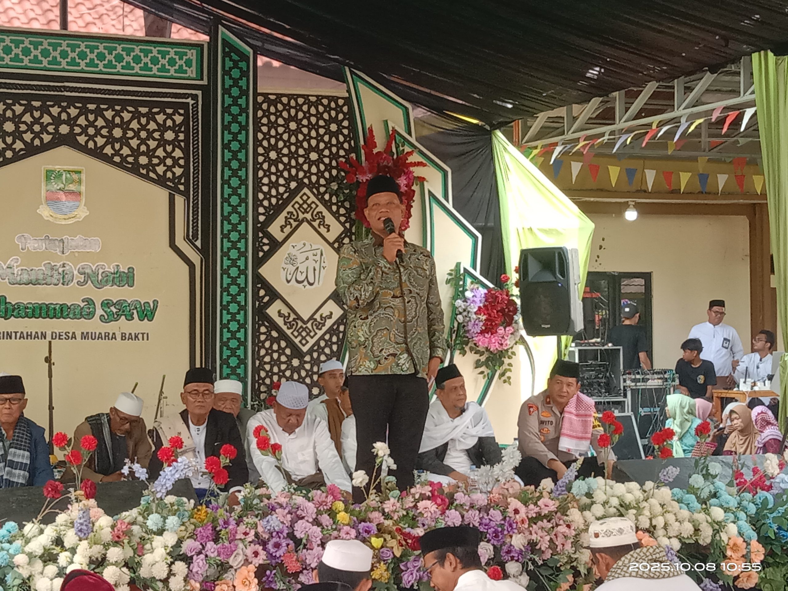 Kepala Desa Muara Bakti, H. Asmawi, dalam sambutannya menyampaikan rasa syukur dan apresiasi atas antusiasme masyarakat yang tinggi dalam menyambut peringatan Maulid Nabi. Menurutnya, kegiatan ini merupakan  momentum mempererat silaturahmi dan memperkuat keimanan warga.